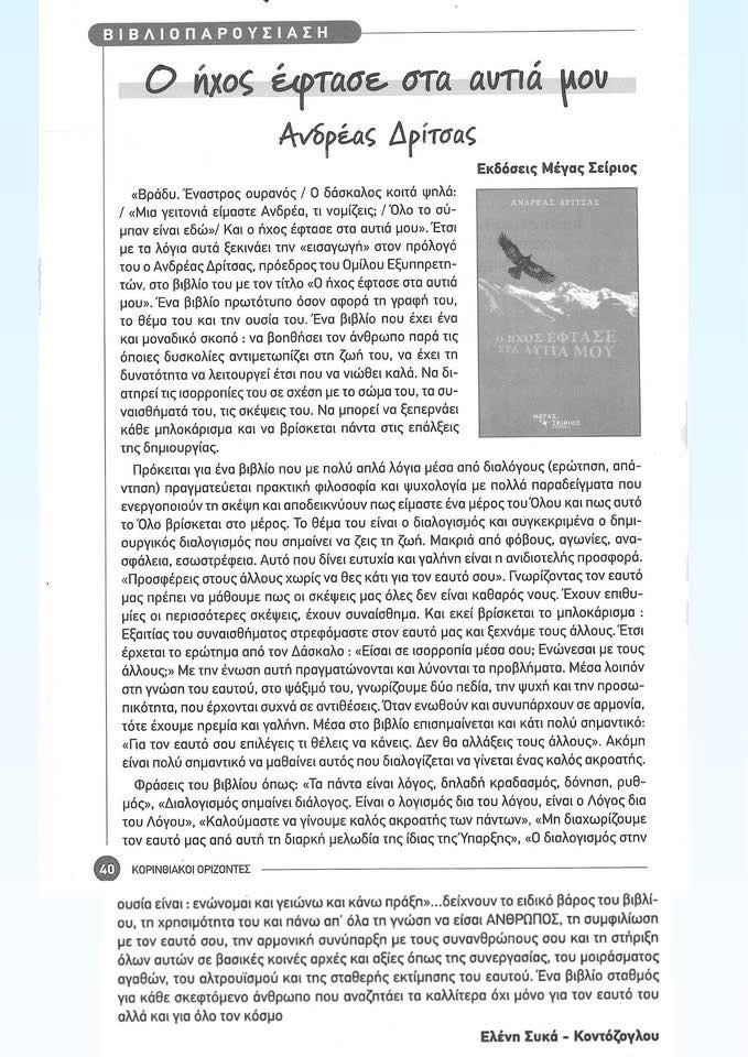 Μία επί της ουσίας παρουσίαση-κριτική για το βιβλίο του Προέδρου του Όμιλος Εξυπηρετητών «Ο ήχος έφτασε στα αυτιά μου» από τις ΕΚΔΟΣΕΙΣ ΜΕΓΑΣ ΣΕΙΡΙΟΣ, μπορείτε να διαβάσετε στο νέο τεύχος του λογοτεχνικού περιοδικού «Κορινθιακοί Ορίζοντες» (τευχ.177, σελ. 40).