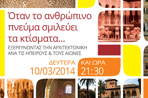 • Παρουσίαση: «Όταν το ανθρώπινο πνεύμα σμιλεύει τα κτίσματα… εξερευνώντας την αρχιτεκτονική ανά τις ηπείρους και τους αιώνες» ,