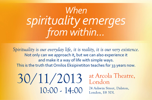 Το Σάββατο 30 Νοεμβρίου πραγματοποιούμε στο Arcola Theatre στο Λονδίνο μια ομάδα ανοιχτή για όλους με θέμα «Όταν η πνευματικότητα αναδύεται από μέσα μας…».