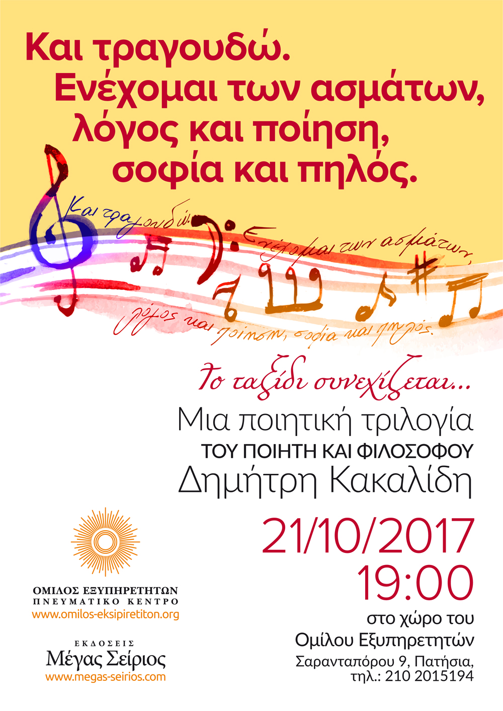 Το Σάββατο 21 Οκτωβρίου 2017 και ώρα 19:00 θα παρουσιάσουμε στο χώρο του Ομίλου Εξυπηρετητών την εκδήλωση με τίτλο «Και τραγουδώ. Ενέχομαι των ασμάτων, λόγος και ποίηση, σοφία και πηλός». Το ταξίδι συνεχίζεται… μια ποιητική τριλογία του σύγχρονου Έλληνα ποιητή και φιλοσόφου Δημήτρη Κακαλίδη.