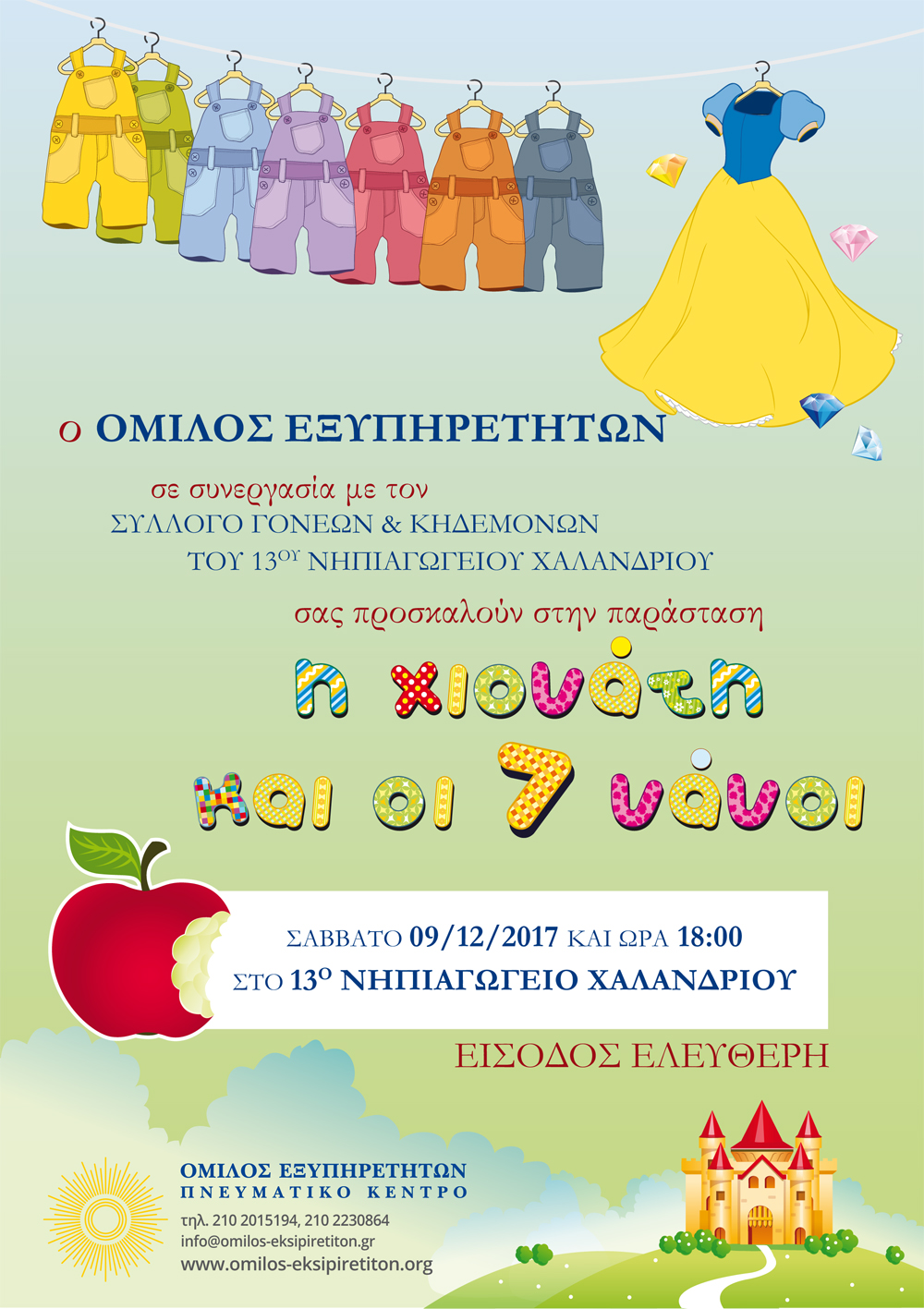 Μετά από πρόσκληση του Συλλόγου Γονέων και Κηδεμόνων, στην οποία δεν θα μπορούσαμε παρά να ανταποκριθούμε, η Χιονάτη με τον Πρίγκιπα, τη Βασίλισσα και όλους τους Νάνους, Κυνηγοί, Αφηγητές, Καθρέφτης και… το Μήλο φυσικά! θα μεταφερθούμε στο σχολικό χώρο των παιδιών, για να τα μεταφέρουμε κι εμείς με τη σειρά μας στον μαγικό κόσμο του παραμυθιού!