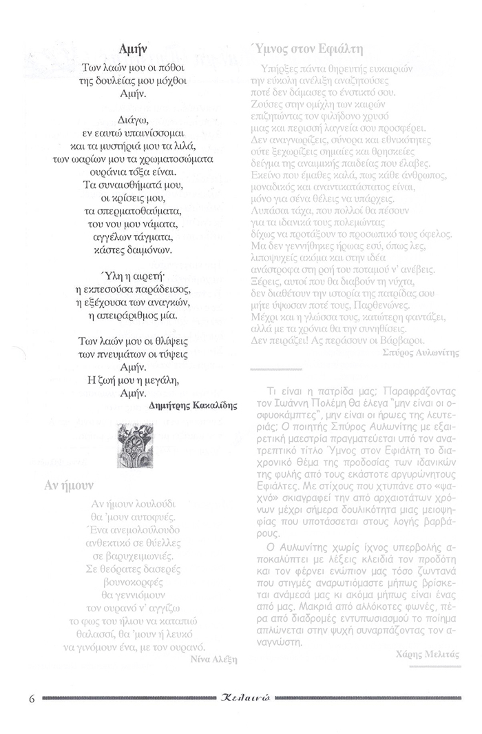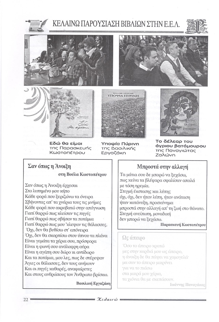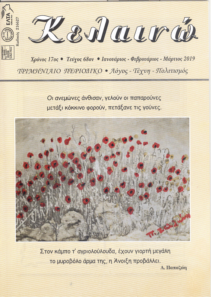Το λογοτεχνικό περιοδικό ΚΕΛΑΙΝΩ, που εκδίδει η διακεκριμένη λογοτέχνιδα κα Παναγιώτα Χριστοπούλου-Ζαλώνη, γνωστό για την πολιτιστική του προσφορά στα Γράμματα και τον Ελληνικό Πολιτισμό, στο πιο πρόσφατο τεύχος του δημοσίευσε ποιήματά μας, καθώς και στιγμιότυπα από την βιβλιοπαρουσίαση που πραγματοποιήθηκε στην Εταιρία Ελλήνων Λογοτεχνών, στις 03-03-2019.