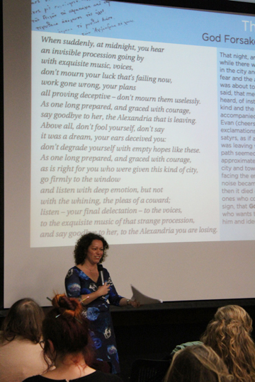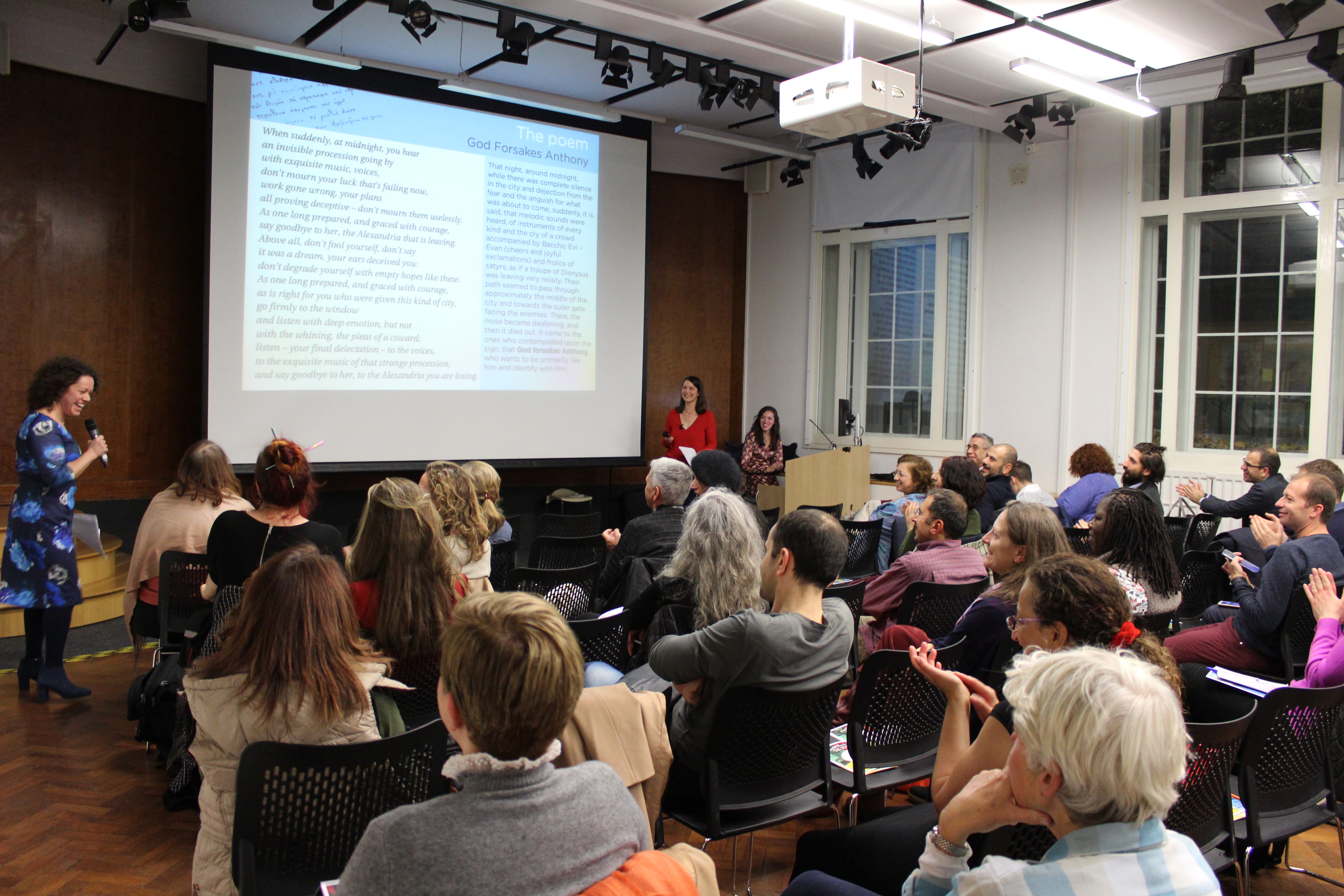 Όλη η εκδήλωση ήταν ένα διαδραστικό, βιωματικό εργαστήρι, όπου το κοινό μετείχε καθώς σιγά-σιγά ξετυλίγαμε μαζί την κρυμμένη σοφία που ενυπάρχει στους στίχους του «Απολείπειν ο Θεός Αντώνιον» του Κ. Π. Καβάφη.
