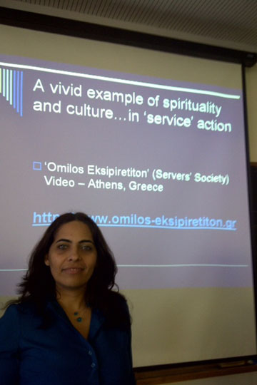 Θέμα της εργασίας της ήταν η σχέση ανάμεσα στην Ψυχοθεραπεία, την Πνευματικότητα και την Κουλτούρα. Στην ομιλία της αυτή, το έργο του Ομίλου Εξυπηρετητών παρουσιάστηκε ως ένα σύγχρονο, ζωντανό παράδειγμα μιας διδασκαλίας, η οποία συνθέτει την συγκεκριμένη και εσωτερική γνώση σε πανανθρώπινο επίπεδο, πέρα από τους συνήθεις ‘διχασμούς’ των διαφόρων ρευμάτων και πολιτισμικών καταβολών. Τονίστηκε πως η πνευματικότητα, όπως έχει διδαχθεί από τον ιδρυτή του Ομίλου, Δημήτρη Κακαλίδη, είναι μια διάσταση και στάση της καθημερινής ζωής που δρα ως ενωτικός κρίκος ανάμεσα στους ανθρώπους, ανεξαρτήτως φυλής, πίστης ή αλλων ειδοποιών χαρακτηριστικών, φέρνοντας τις δυνάμεις της αυτοθεραπείας και συλλογικής εργασίας σε άμεση έκφραση.