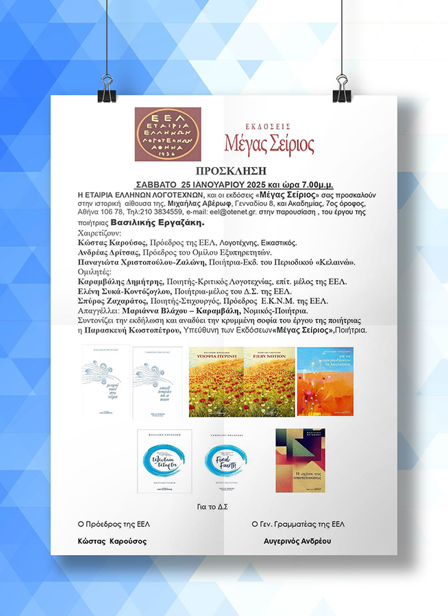 Σε συνεργασία με την Εταιρία Ελλήνων Λογοτεχνών στις 25/01/2025 θα παρουσιάσουμε το έργο της Βασιλικής Εργαζάκη