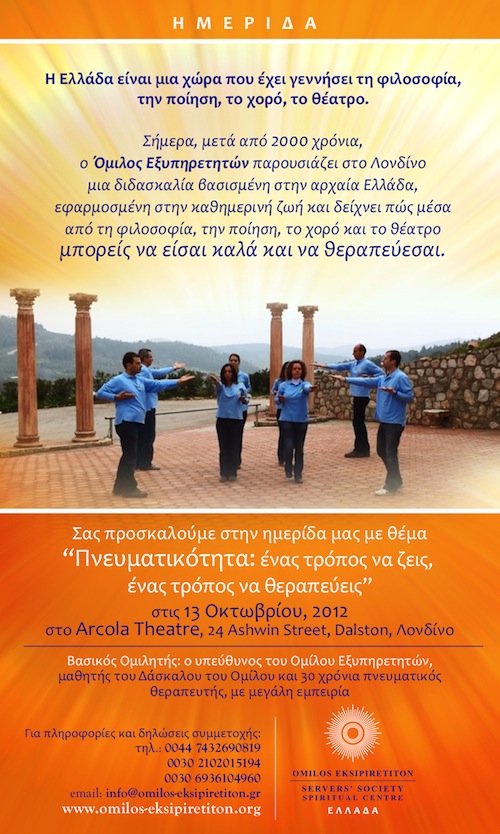Επαγγελματίες από το χώρο των ανθρωπιστικών επιστημών και της υγείας στο Λονδίνο, οι οποίοι παρακολούθησαν τα διεθνή σεμινάρια μας στην Ελλάδα καθώς και παρουσιάσεις μας σε επιστημονικά συνέδρια στο εξωτερικό, μας ζήτησαν να κάνουμε παρουσίαση της διδασκαλίας και του έργου του Ομίλου στην Αγγλία.