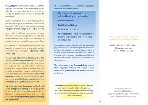 Ελάτε να σας παρουσιάσουμε την Τέχνη της Ζωής και της Πνευματικής Θεραπείας, όπως τη διδαχτήκαμε και την εφαρμόζουμε καθημερινά στη ζωή μας, να γνωριστούμε και να σας μεταφέρουμε τους θησαυρούς της «διανοιακής σκέψης και θέσης».